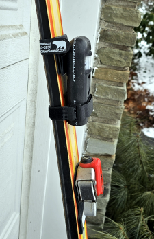 The ski mount is extremely light weight and easy to mount to a ski but its drawbacks are that the ski must be embeded in snow and pointed in the coverage direction and the ski needs to be slightly tilted backwards to make the Critter Gitter vertical and not pointed downward.